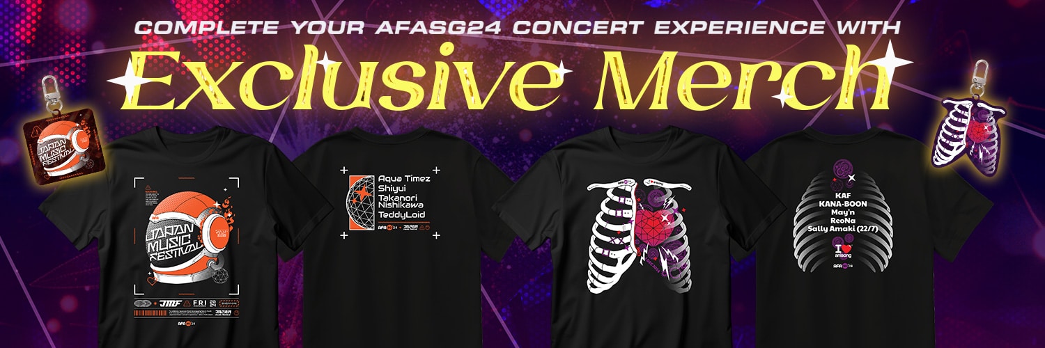 Commemorate your concert experience with AFA x Japan Music Festival and AFA x I LOVE ANISONG official merchandise, featuring t-shirts and keychains!