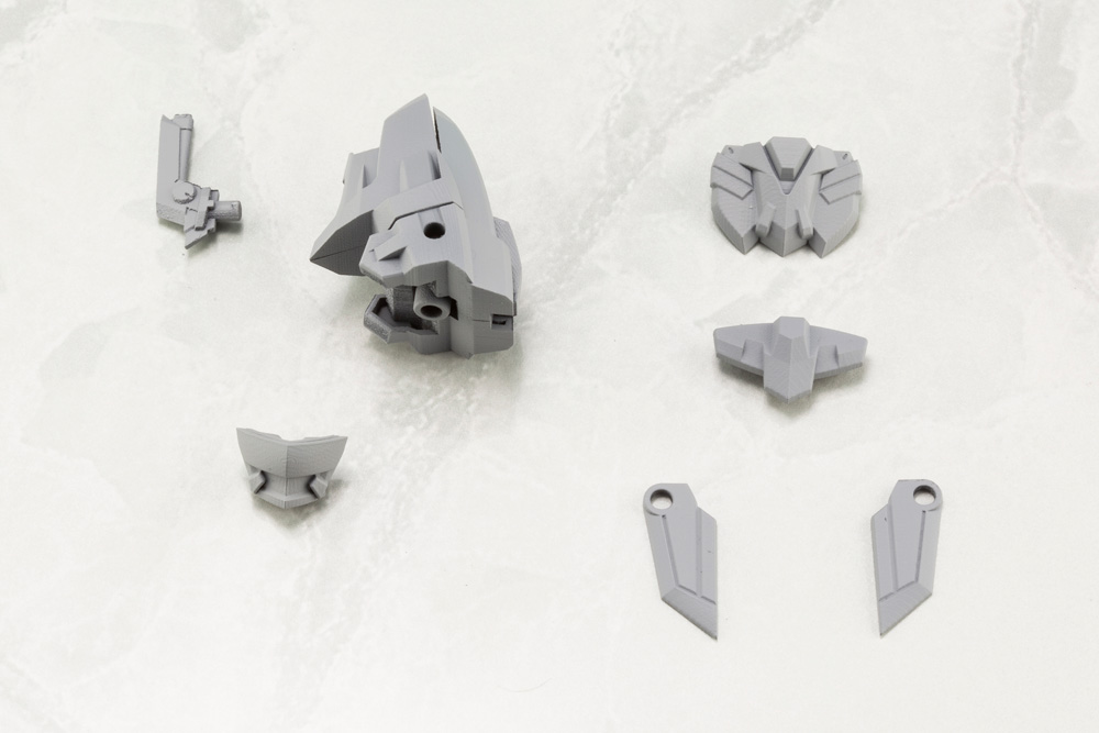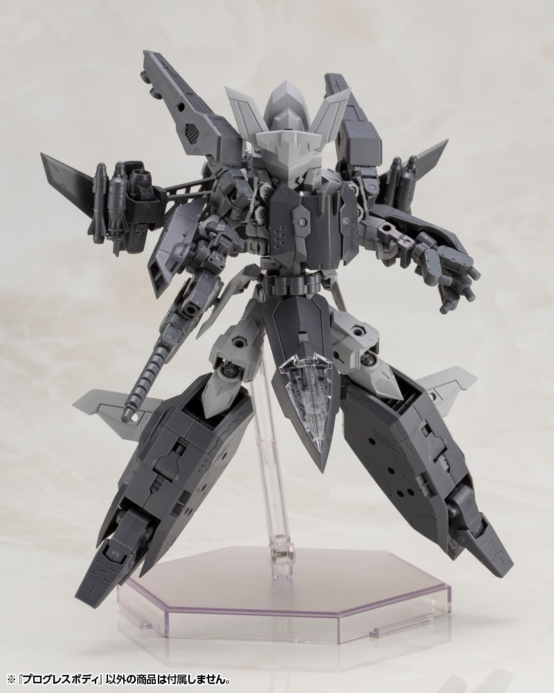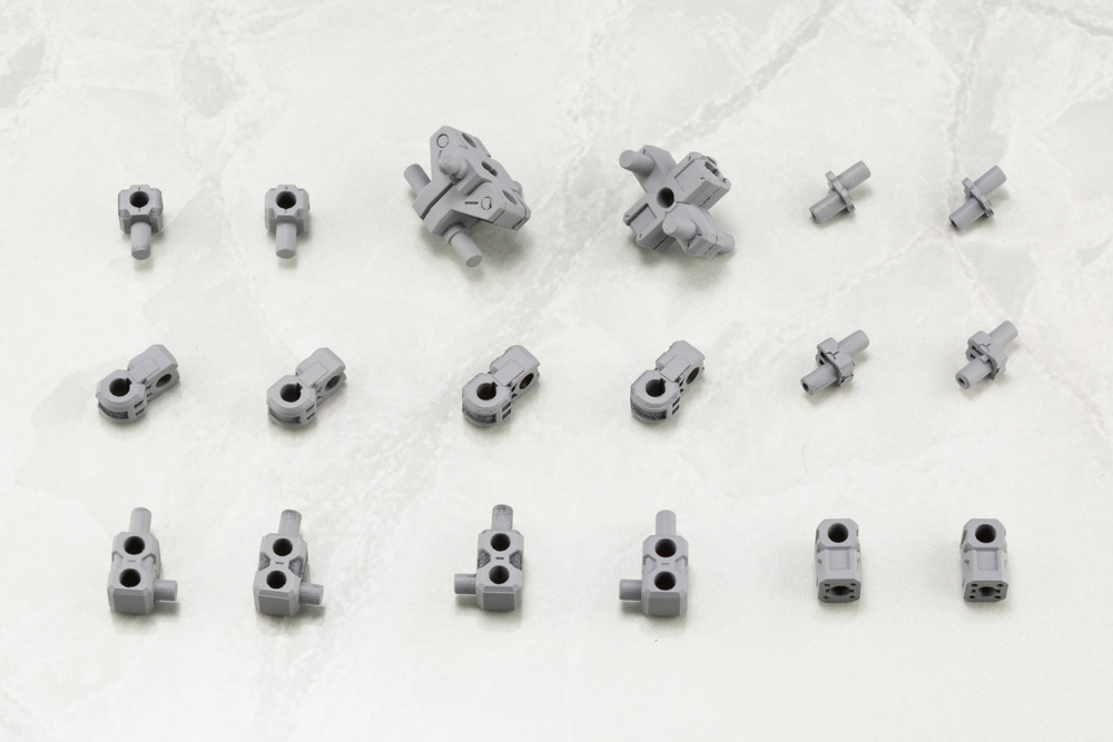 “The concept of this main body is to incorporate easy-to-use basic blocks for user customization. The core portion is constructed with simply designed joints that have multiple 3mm connection points that allows for a wide range of customization options with other products. The 3mm connection joints are of the standard type used in Frame Arms, Hexa Gear, Frame Arms Girl, and the Megami Device series for users create countless unique mecha to enjoy. |